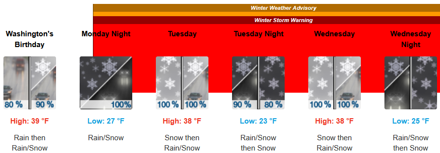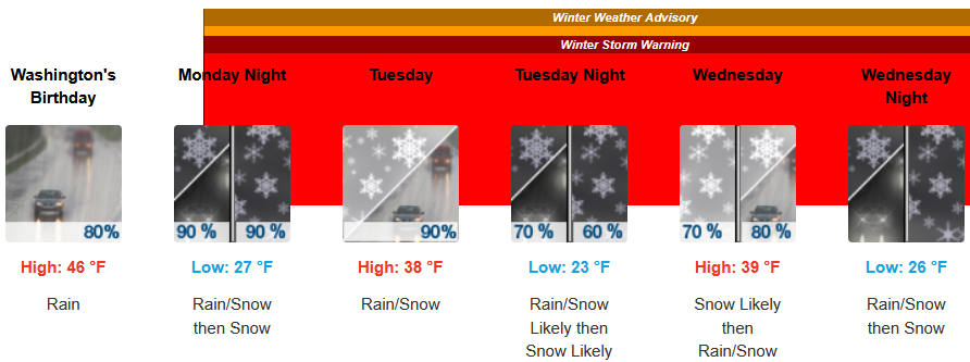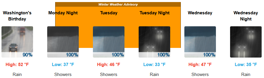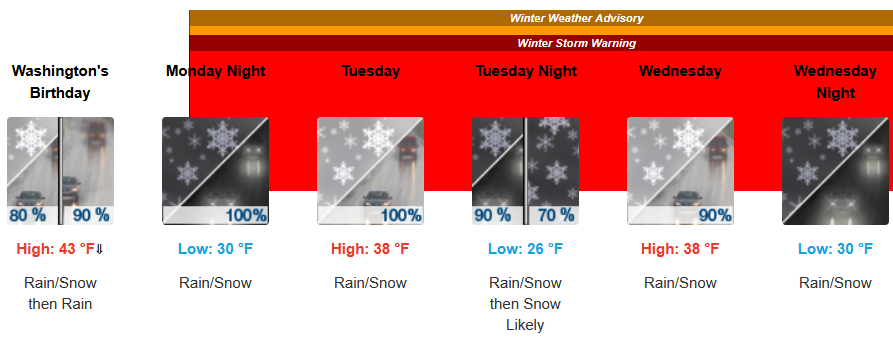The National Weather Service has issued Winter Storm Warnings for inland areas which are expected to see rain, snow and cold temperatures bringing snow levels down to 1,300′ by midweek. Afternoon highs are expected to start the work week in the low to mid to low 40’s, falling to the mid to upper 30’s, with lows forecast to be in the low to mid to upper 20’s..